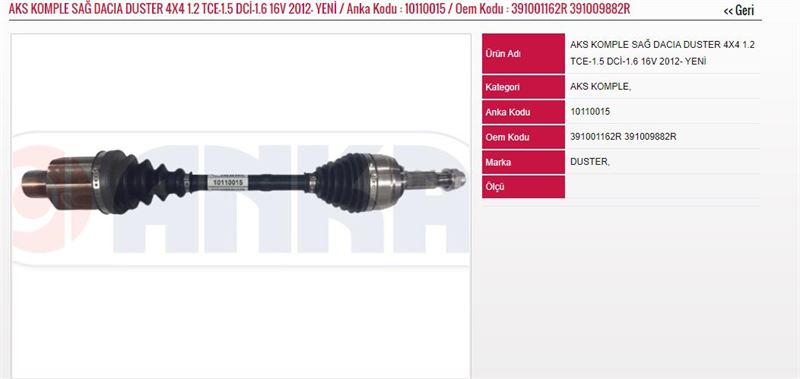 AKS KOMPLE SAĞ DACIA DUSTER 4×4 2012- 1.2TCE 1.5DCI 1.6 16V (1 AD )