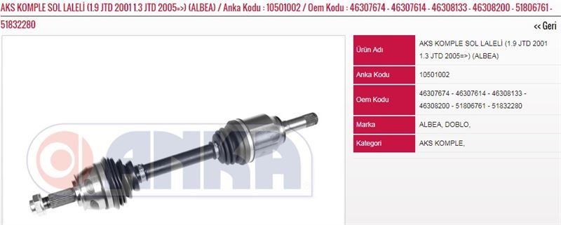 AKS KOMPLE SOL LALELİ 1.9 JTD 01=>/PALIO-ALBEA 1.3 JTD 05=> FIAT DOBLO 00-10-ALBEA (1 AD )