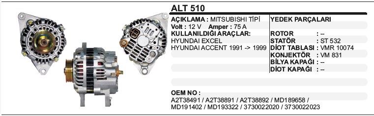ALTERNATÖR 12V 75A HYUNDAI EXCEL / ACCENT 91-99 MITSUBISHI TİP (1 AD )