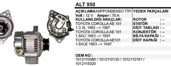 ALTERNATÖR TOYOTA COROLLA 1.3; COROLLA 1.3 12V; COROLLA 1.3 12V HATCHBACK; COROLLA 1.3 12V LİFTBACK; (1 AD )