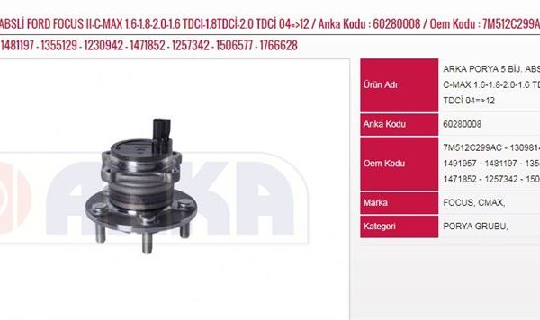 ARKA PORYA 5 BİJ. ABSLİ 1.6-1.8-2.0-1.6 TDCI-1.8TDCİ-2.0 TDCİ 04=>12 YENİ FORD FOCUS II CMAX (1 AD )