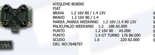 ATEŞLEME BOBİNİ FIAT BRAVA BRAVO 95-01 MAREA 12V 96- PALIO 01- PUNTO 1.2/1.4 96-99 SCUDO 1.6 96- . (1 AD )