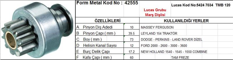 MARŞ DİŞLİSİ 10 DİŞ 12 KANAL LUCAS TİPİ MASSEY FERGUSON PERKINS LAND ROVER FORD DODGE/JCB/LAND ROVER LUCAS TYP DS=10 DKÇ=40 BOY=73 KS=12 BDÇ=17 GÇ=60 (1 AD )