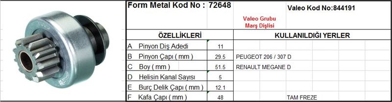 MARŞ DİŞLİSİ 11 DİŞ 5 KANAL VALEO TİPİ PEUGEOT 206 307 RENAULT MEGANE TAM FREZE (1 AD )