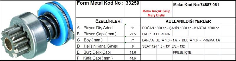 MARŞ DİŞLİSİ 11 DİŞ 6 KANAL MAKO TİPİ TOFAS DOGAN SAHIN KARTAL M124 M131 LANCIA DELTA FREZE İÇTE DS=11 DKÇ=29,5 BOY=71 KS=6 BDÇ=11,6 GÇ=44,5 (1 AD )