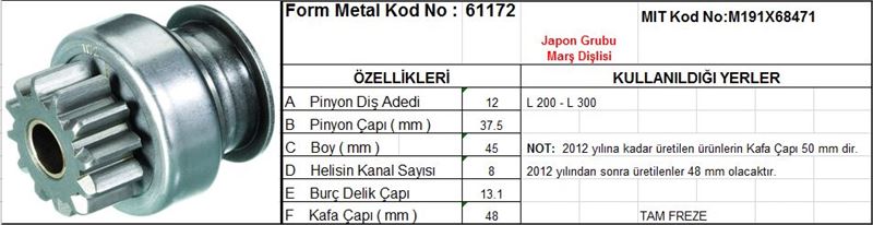 MARŞ DİŞLİSİ 12 DİŞ 8 KANAL JAPON TİPİ MITSUBISHI L200 L300 TAM FREZE DS=12 DKÇ=37,5 BOY=51,5 KS=8 BDÇ=13,1 GÇ=50 (1 AD )