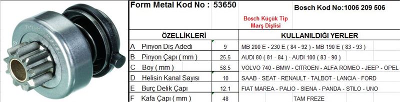MARŞ DİŞLİSİ 9 DİŞ 10 KANAL BOSCH TİPİ MERCEDES 200 230 AUDI 80 100 VOLVO 740 BMW CITROEN TAM FREZE DS=9 DKÇ=25,8 BOY=58,5 KS=10 BDÇ=12 GÇ=48 (1 AD )