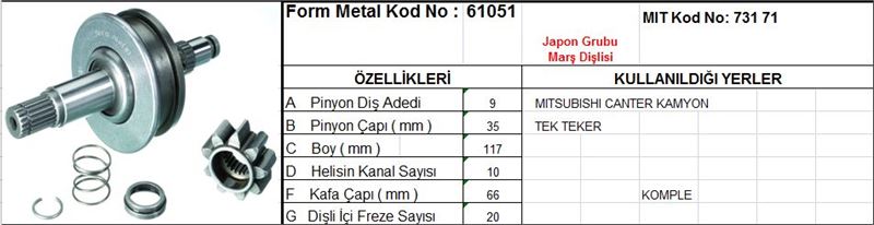 MARŞ DİŞLİSİ 9 DİŞ 10 KANAL JAPON TİPİ MITSUBISHI CANTER KAMYON TEK TEKER KOMPLE DS=9 DKÇ=35 BOY=117 KS=10 GÇ=66 DİF=20 (1 AD )