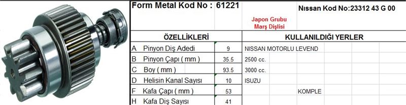 MARŞ DİŞLİSİ 9 DİŞ 10 KANAL JAPON TİPİ NISSAN MOTORLU LEVEND 2,5 3.0 ISUZU KOMPLE DS=9 DKÇ=35,5 BOY=93,5 KS=10 GÇ=53 KDS=41 (1 AD )