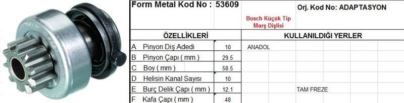 MARŞ DİŞLİSİ 9 DİŞ 10 KANL BOSCH TİPİ AUDI 80 FIAT DUCATO VW VENTO OPEL VECTRA PEUGEOT 306 TAM FREZE DS=9 DKÇ=25,8 BOY=53,5 KS=10 BDÇ=12 GÇ=46,5 (1 AD )
