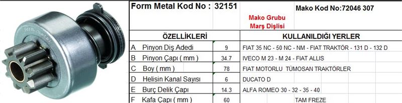 MARŞ DİŞLİSİ 9 DİŞ 6 KANAL MAKO TİPİ FIAT 35NC 50NC IVECO M23 DUCATO TUMOSAN ALFA ROMEO TAM FREZE DI?. FR. DS=9 DKÇ=34,7 BOY=78 KS=6 BDÇ=14,3 GÇ=60 (1 AD )