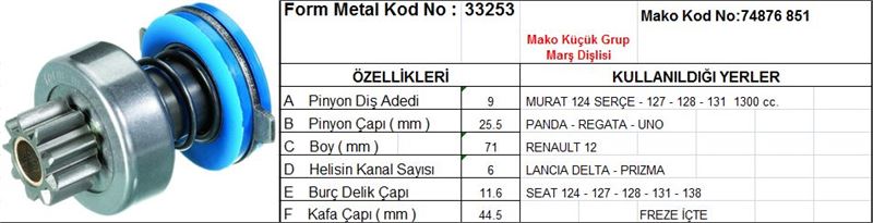 MARŞ DİŞLİSİ 9 DİŞ 6 KANAL MAKO TİPİ TOFAS M124 SERCE M131 REGATA UNO R12 LANCIA DELTA FREZE İÇTE DS=9 DKÇ=25,5 BOY=71 KS=6 BDÇ=11,6 GÇ=44,5 (1 AD )