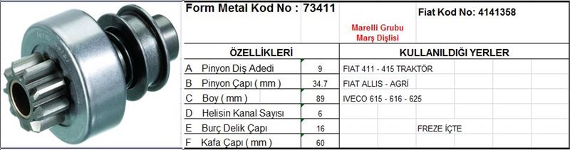MARŞ DİŞLİSİ 9 DİŞ 6 KANAL MARELLI TİPİ FIAT 411 415 ALLIS IVECO TRAKTOR FREZE ICTE (1 AD )