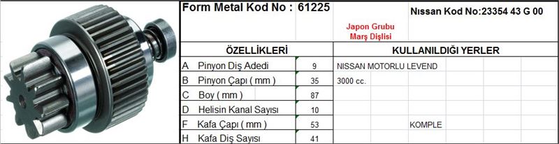 MARŞ DİŞLİSİ 9DİŞ NISSAN LEVEND 3.0 10KANAL BOSCH TYP DS=9 DKÇ=35 BOY=87 KS=10 GÇ=53 KDS=41 (1 AD )