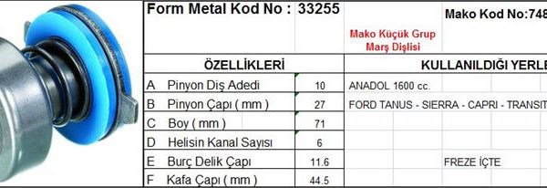 MARŞ DİŞLİSİ 10 DİŞ 6 KANAL MAKO TİPİ ANADOL 1,6 FORD TAUNUS SIERRA CAPRI TRANSIT 1,6 FREZE İÇTE DS=10 DKÇ=27 BOY=71 KS=10 BDÇ=11,6 GÇ=44,5 (1 AD )