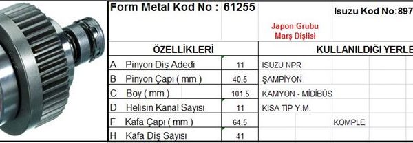 MARŞ DİŞLİSİ 11 DİŞ 11 KANAL JAPON TİPİ ISUZU CHAMPION NPR KISA TIP KOMPLE DS=11 DKÇ=40,5 BOY=103,4 KS=11 GÇ=64,5 KDS=41 (1 AD )