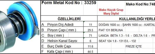 MARŞ DİŞLİSİ 11 DİŞ 6 KANAL MAKO TİPİ TOFAS DOGAN SAHIN KARTAL M124 M131 LANCIA DELTA FREZE İÇTE DS=11 DKÇ=29,5 BOY=71 KS=6 BDÇ=11,6 GÇ=44,5 (1 AD )