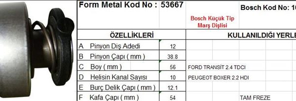 MARŞ DİŞLİSİ 12 DİŞ 10 KANAL BOSCH TİPİ FORD TRANSIT 2.4 TDCI PEUGEOT BOXER 2.2 HDI TAM FREZE DS=12 DKÇ=37,6 BOY=57,4 KS=10 BDÇ=12,1 GÇ=52 (1 AD )