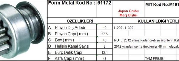 MARŞ DİŞLİSİ 12 DİŞ 8 KANAL JAPON TİPİ MITSUBISHI L200 L300 TAM FREZE DS=12 DKÇ=37,5 BOY=51,5 KS=8 BDÇ=13,1 GÇ=50 (1 AD )