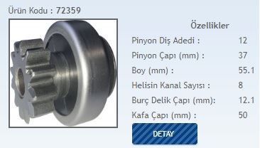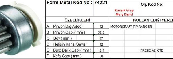 MARŞ DİŞLİSİ 12 DİŞ 12 KANAL MOTOCRAFT TİPİ FORD RANGER FREZE AZ ICTE DS=12 DKÇ=37,5 BOY=47 KS=12 BDÇ=12,1 GÇ=47,5 (1 AD )