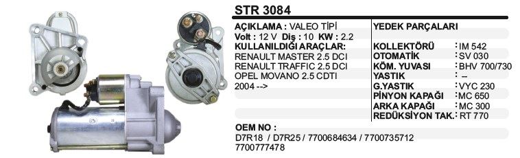 MARŞ MOTORU 10 DİŞ 12V D7R RENAULT MASTER/TRAFFIC 2.5DCI OPEL MOVANO 2.5DCI 04-> VALEO TİP (1 AD )