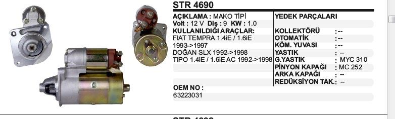 MARŞ MOTORU 12V 9DİŞ FIAT TIPO/TEMPRA/DOĞAN SLX DKŞ 223031 MAKO TİP STR 3101 (1 AD )