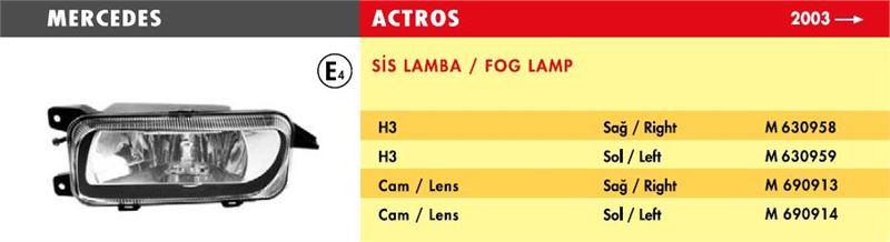 SİS LAMBA MERCEDES ACTROS / SOL (AVRUPA TİP) (1 AD )